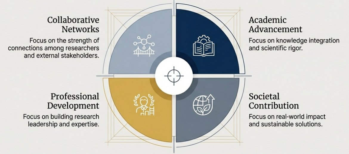 Dimensions and Evaluation of Interdisciplinary Research Success An-Najah National University assesses interdisciplinary research across four interconnected dimensions: academic advancement and knowledge integration, societal contribution and real-world impact, professional development and research leadership, and the strength of collaborative networks among researchers and stakeholders. This multidimensional approach ensures a balanced evaluation, guiding sustainable growth and meaningful outcomes.