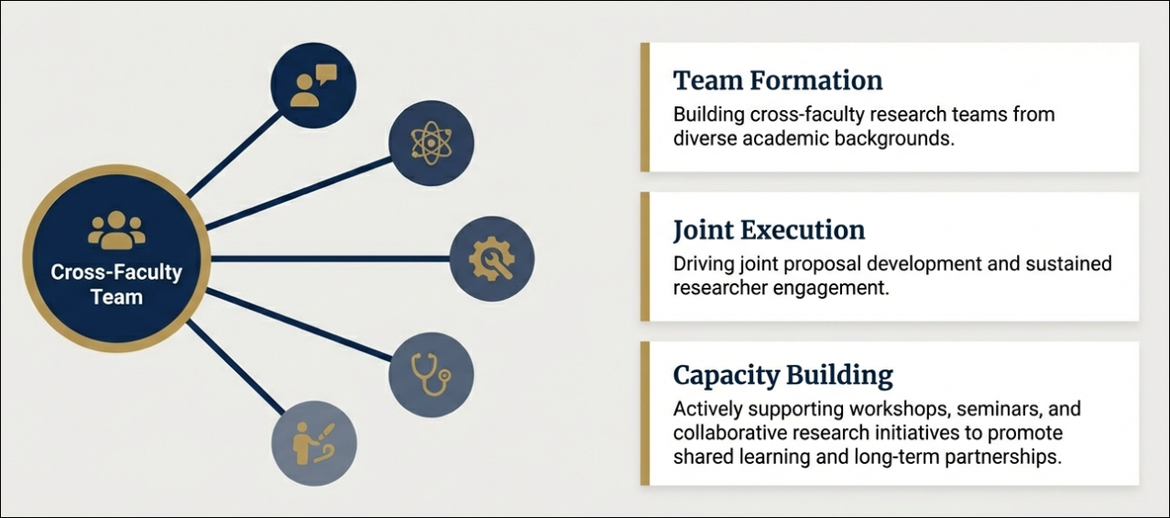 Dedicated research development and administrative teams provide continuous support to faculty members in preparing competitive cross-disciplinary proposals, ensuring alignment with strategic priorities and funding requirements.
